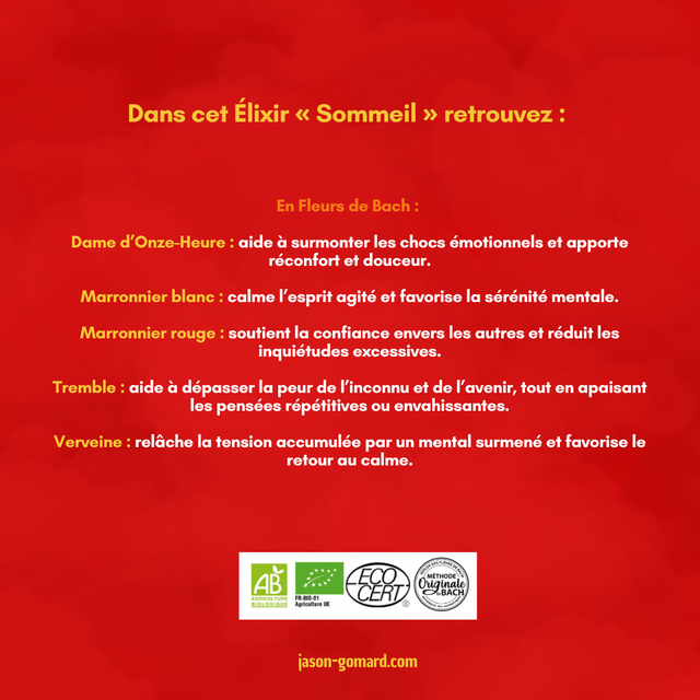 L’Élixir Sommeil aux fleurs de Bach certifié bio est spécialement formulé pour accompagner les personnes ayant des difficultés d’endormissement ou un sommeil léger et non réparateur.